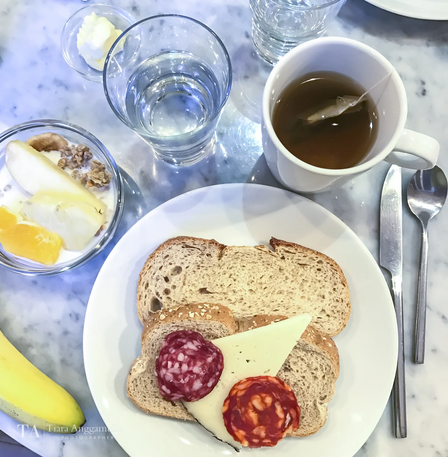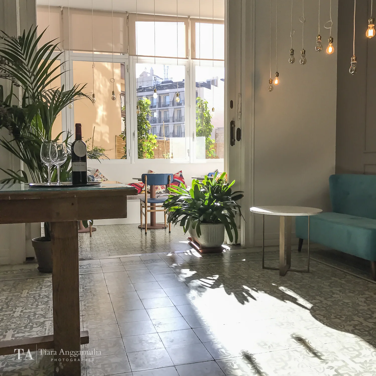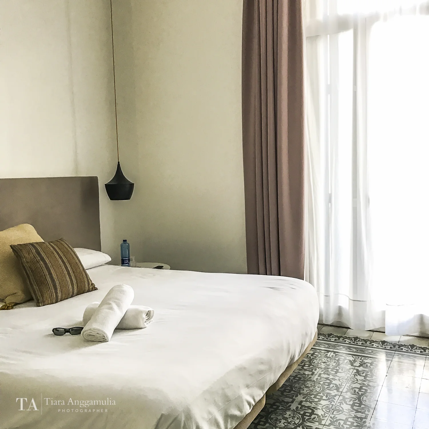 Rooms are decorated in a minimalist style and it is rather spacious for Barcelona standard. Some rooms have city views with floor-to-ceiling french doors that open onto a small balcony. The dining and sitting area is a feature that I love most about this hotel. Buffet breakfast is served here each morning. There are two brightly coloured teal sofas with book shelves on one side of the sitting area and a coffee table. A few potted indoor plants are placed near the coffee table and a dividing pillar. On the opposite side is a large window and immediately below the window is a row of round marble top dining tables and chairs with colourful cushions. It's definitely a favourite spot during breakfast time when delicious Spanish breakfast is laid out attractively on the big table in the centre of the room with beautiful morning light streaming into the room.