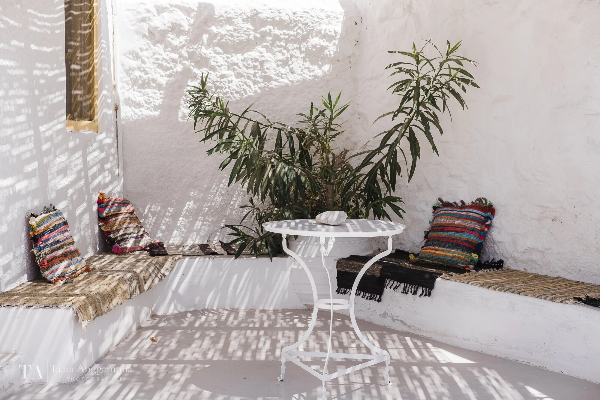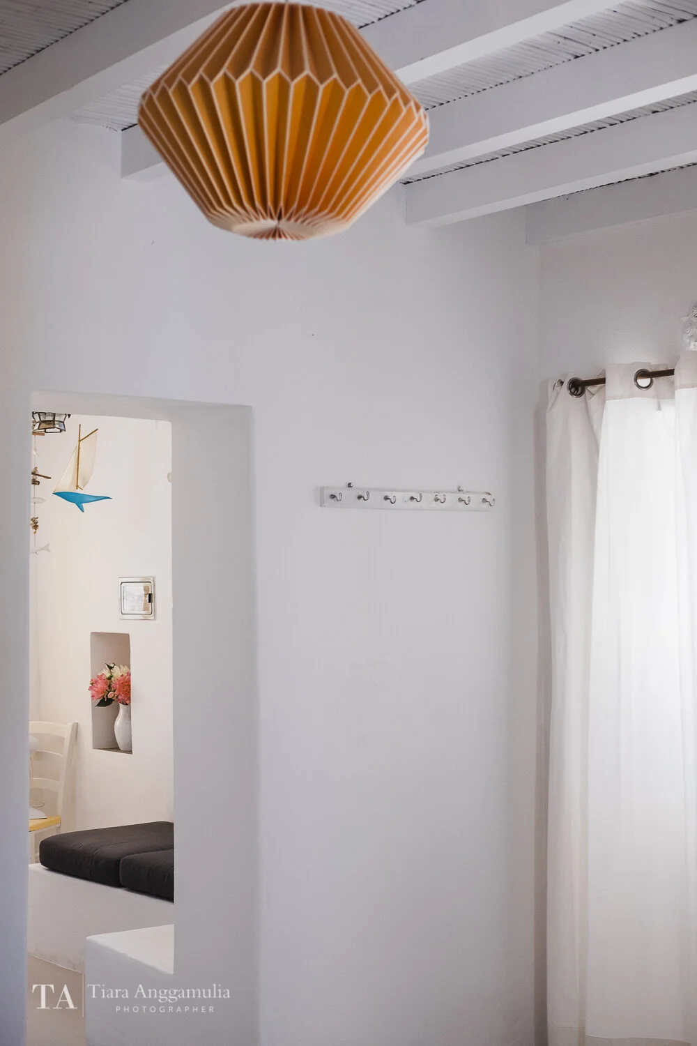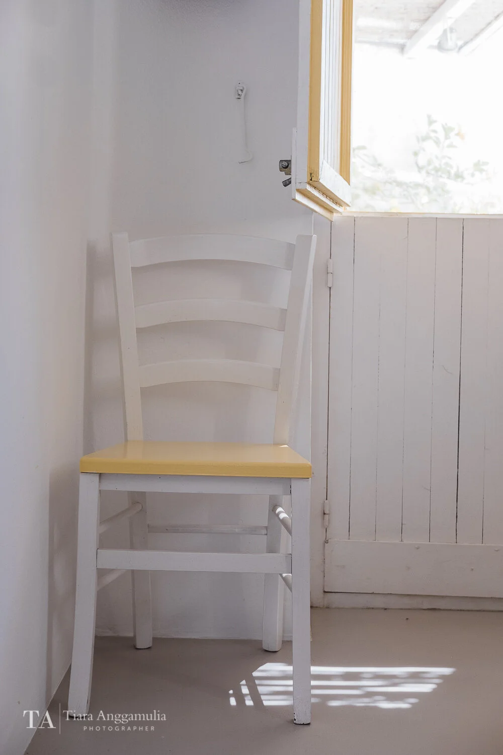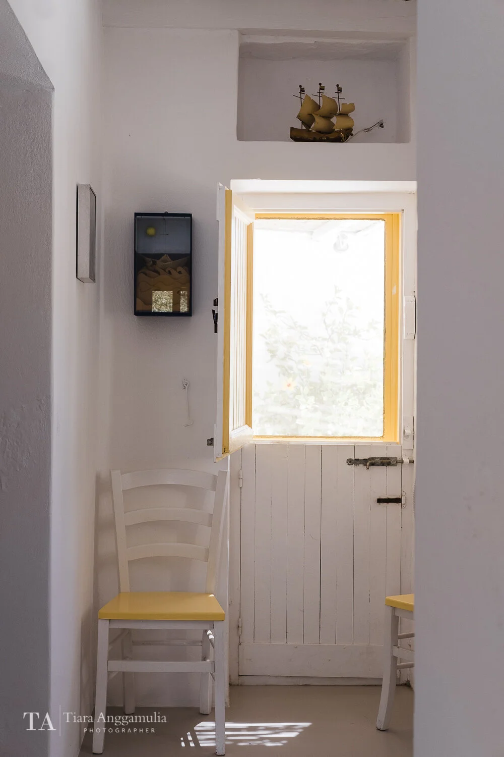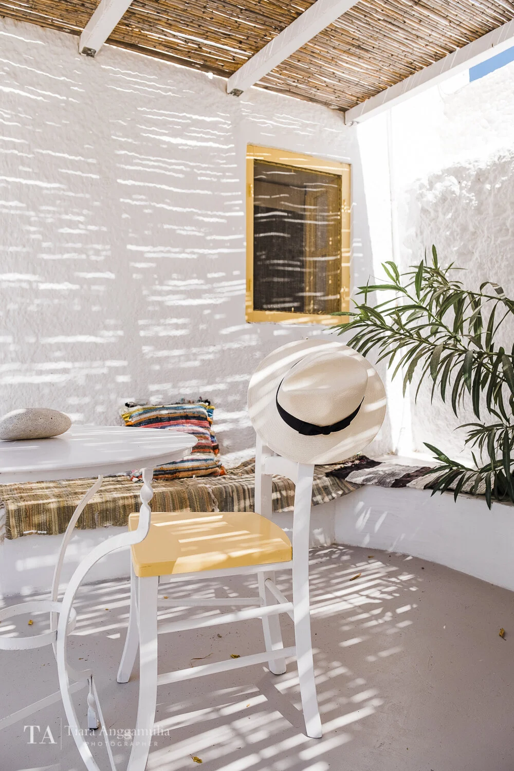 The house is painted white with yellow wooden windows. It’s cute, cosy and it has an open terrace with washing lines and an outdoor seating area which I love. It’s a haven of calm and the perfect place to unwind.