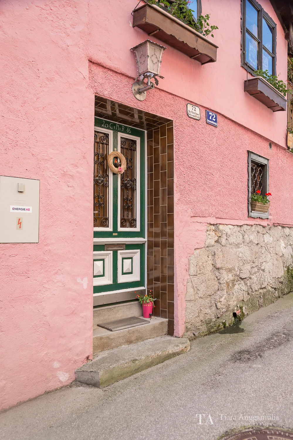 Cute and colourful facades. Flower pots adorn the window sills. Rustic and old wooden windows. You will not miss these sights. The view towards the emerald green glassy lake and the majestic mountains in the background brings calmness and tranquility to whoever visits this popular tourist spot.